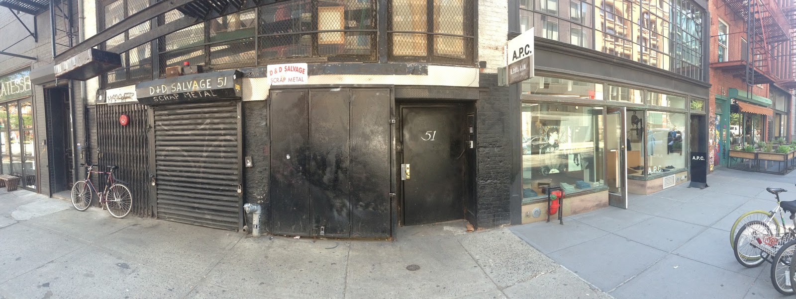 And nearby are signs for a scrap metal business called D&D Salvage Corp. next to an upscale clothing store called A.P.C.